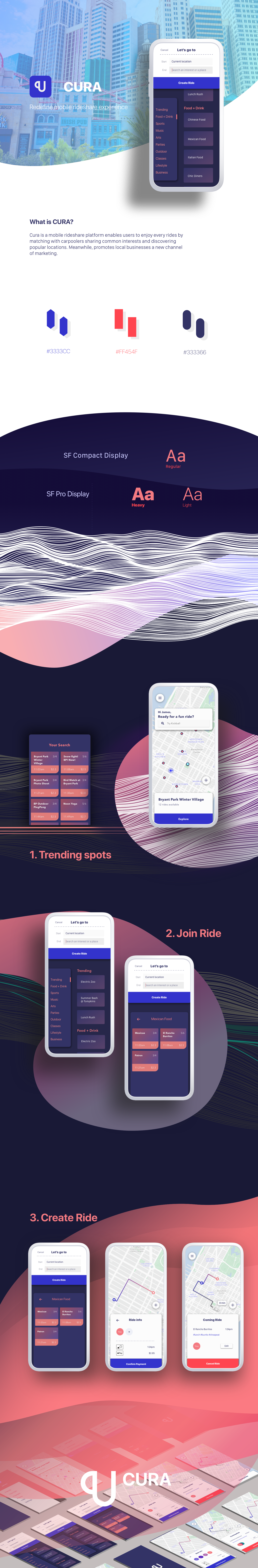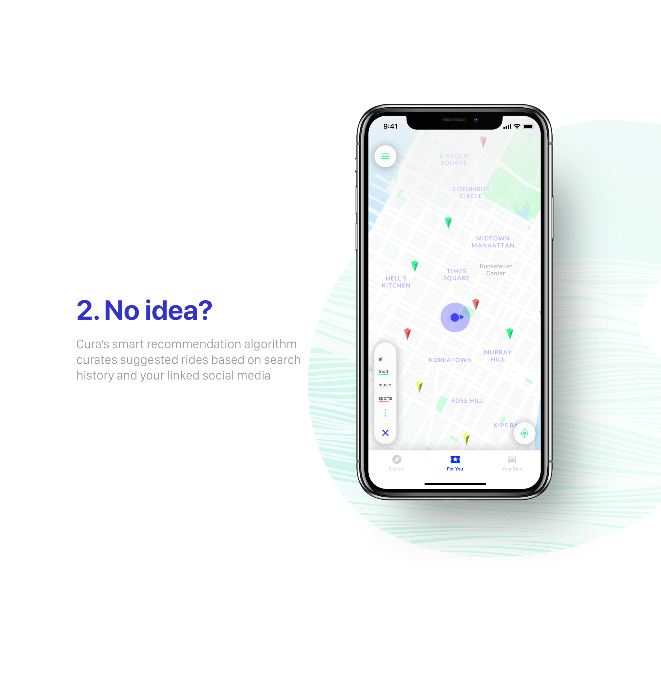 CURA is a project extended from my self-driving car research at Cornell Tech. It is a conceptual exploration of how easy it would be for us to carpool with anyone based on common interests. With the ubiquitous presence of self-driving cars, cheap, convenient, and efficient transportation makes shared-vehicle a place where people often access, and thus, generates new forms of social interactions. The numbers of carpools have been growing in recent years thanks to services such as Lyft and Uber. A trip is initiated by the destination of the first passenger, and is shaped by every passenger that have a location in mind. What if, we could start a trip by the purpose of the place, explore and join ride based on a hobby or an experience in ease? Say, Mexican food lunch, Drake’s concert, or a yoga class. A commute would not only be a time-consuming sitting experience but the starting point of a complete experience a location provides. Vehicles would become where new meetups happen.