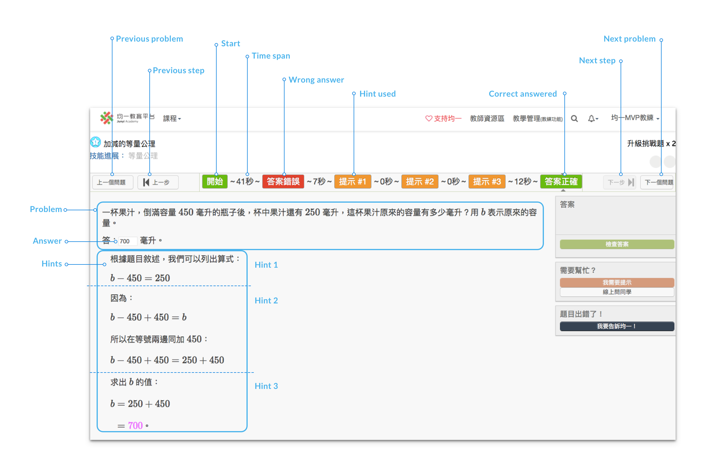 A teacher would like to know the process of a student answering a question, the number of hints used, and how many times student try before getting the right answer.