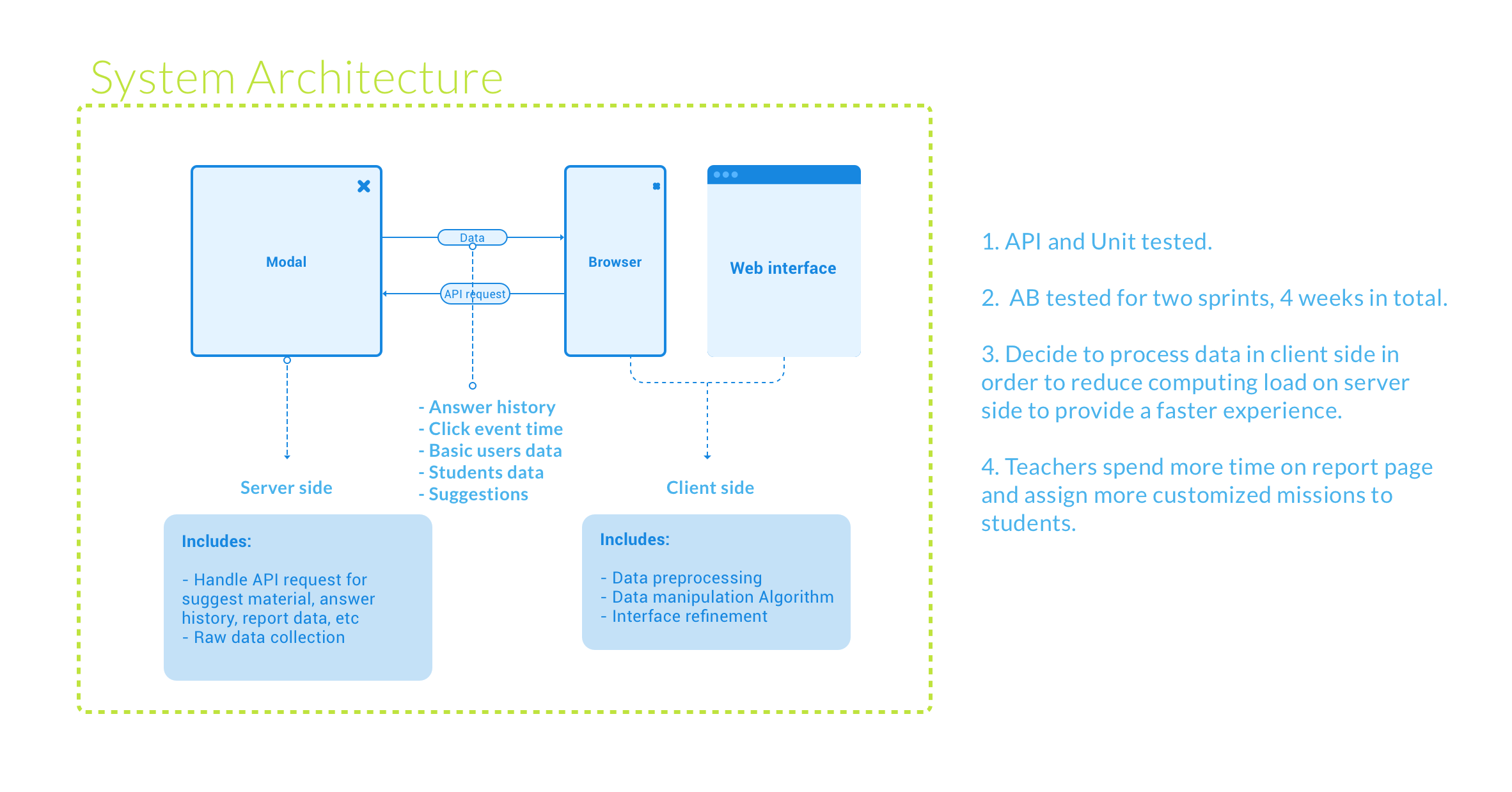The system was a/b tested for another two sprints, which is four weeks in total to make sure no serious bug was reported. Users behaviors were recorded and analyzed on BigQuery platform and Google Analytic platform, which we found an increasing trend of teachers assigning customized learning materials to students, alongside with a rise on time spent on the report. Finally, the new report system was deployed to live server serving more than 600K users at that time.