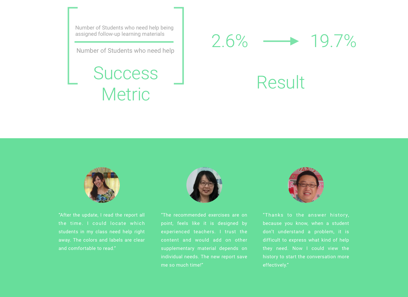 Adding on the previous point, we conducted contextual inquiries in three different classes, interviewed more than five teachers which we found that no matter in urban or rural areas, what teachers care the most is if the student need help on his/her learning
